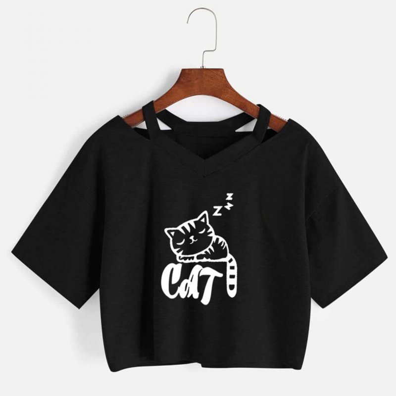 Explosive cat print V-neck short T-shirt